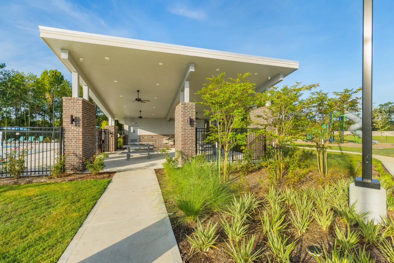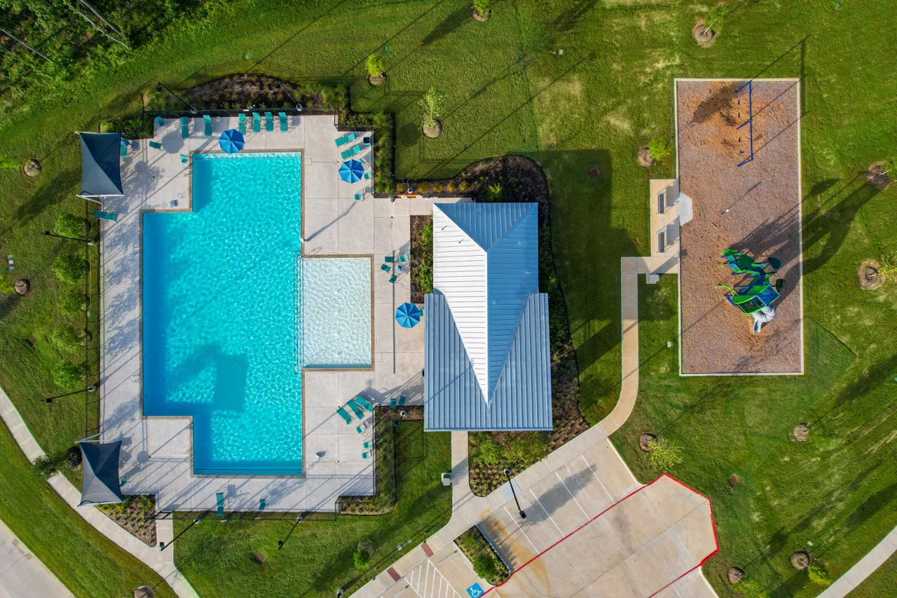 The Grand Pines Recreation Center provides an extensive range of features designed to fulfill residents' recreational and social interests. Created with a clear focus on swimming and play, the center includes an expansive 5,000 SF resort-style pool, suitable for both leisurely swims and active workouts, along with a large playground that offers endless entertainment for children. The center also includes an adjacent restroom building and a covered pavilion, adding convenience and shelter for those enjoying the amenities.