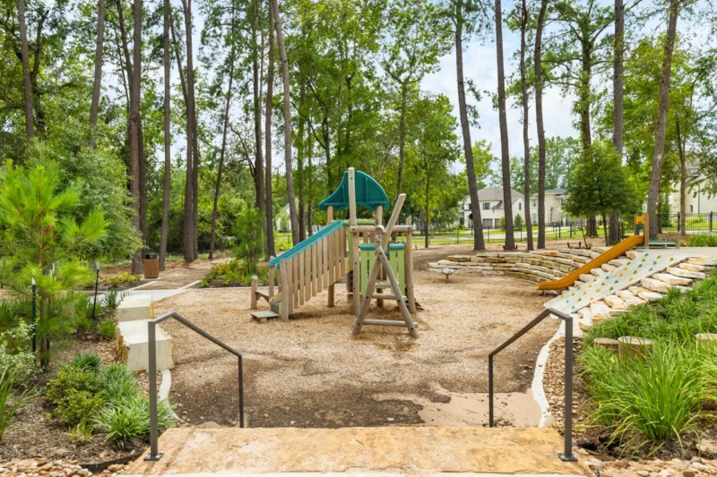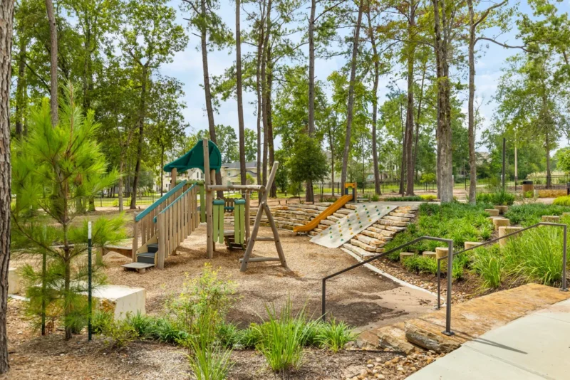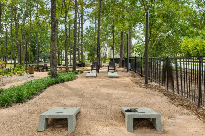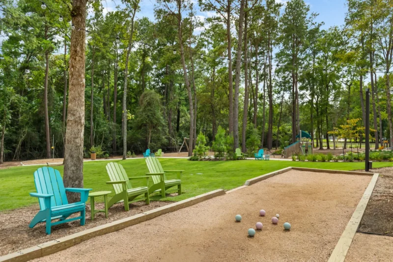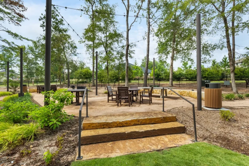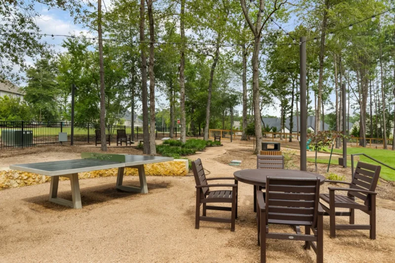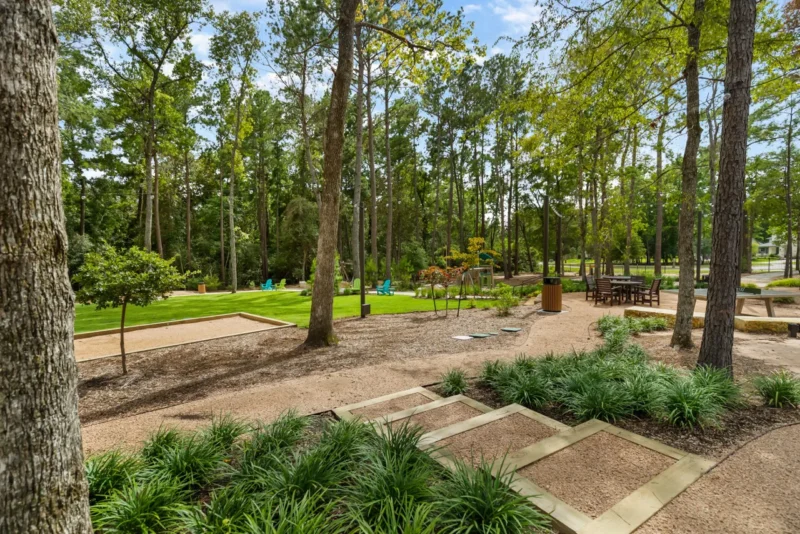 Bronze Trace Park in Woodforest is a charming neighborhood retreat that offers a harmonious blend of natural beauty and recreational amenities. This park features a well-designed playground, a family bistro area with dining room size tables, an well lit activity area with corn hole and bocce ball and open green spaces for all to play. Winding walking paths offer scenic routes for leisurely strolls or brisk walks, making Bronze Trace Park a beloved spot for residents seeking to unwind and enjoy the outdoors in a family-friendly environment.