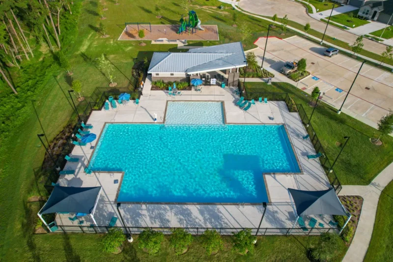 The Grand Pines Recreation Center provides an extensive range of features designed to fulfill residents' recreational and social interests. Created with a clear focus on swimming and play, the center includes an expansive 5,000 SF resort-style pool, suitable for both leisurely swims and active workouts, along with a large playground that offers endless entertainment for children. The center also includes an adjacent restroom building and a covered pavilion, adding convenience and shelter for those enjoying the amenities.